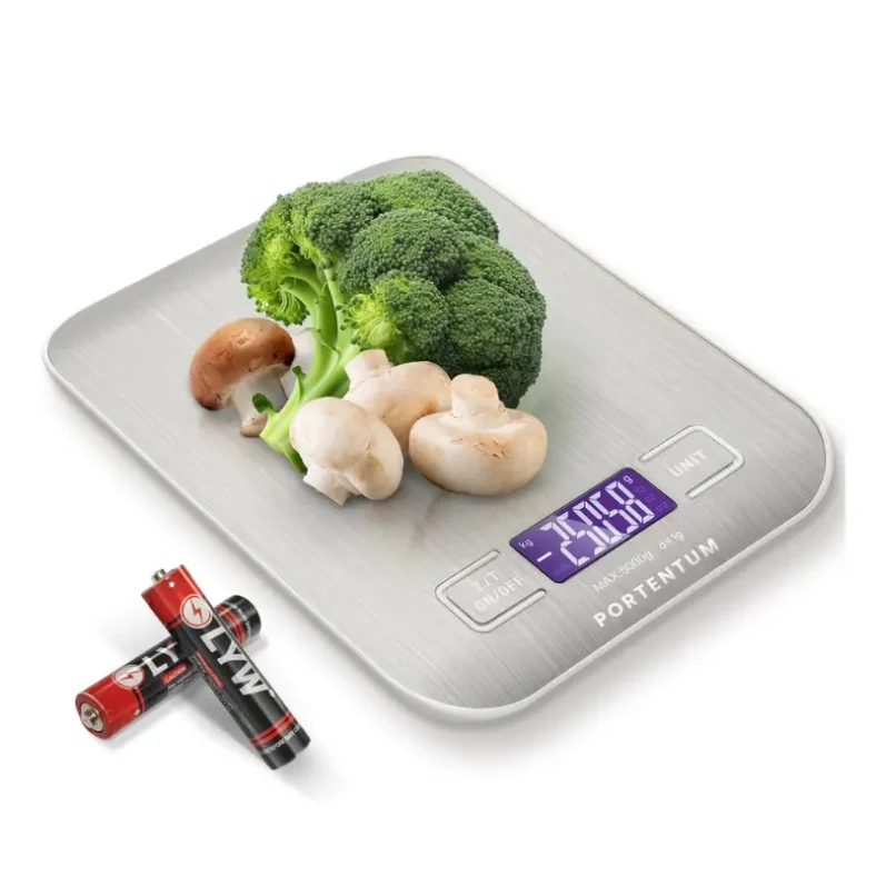 La báscula de cocina PORTENTUM ofrece una medición precisa gracias a sus cuatro sensores de alta precisión, que permiten pesar con exactitud desde 1 gramo hasta un máximo de 5 kg. Esta precisión es ideal tanto para pequeñas cantidades como para grandes volúmenes, lo que la convierte en una herramienta confiable para cualquier tipo de receta 🍰.
