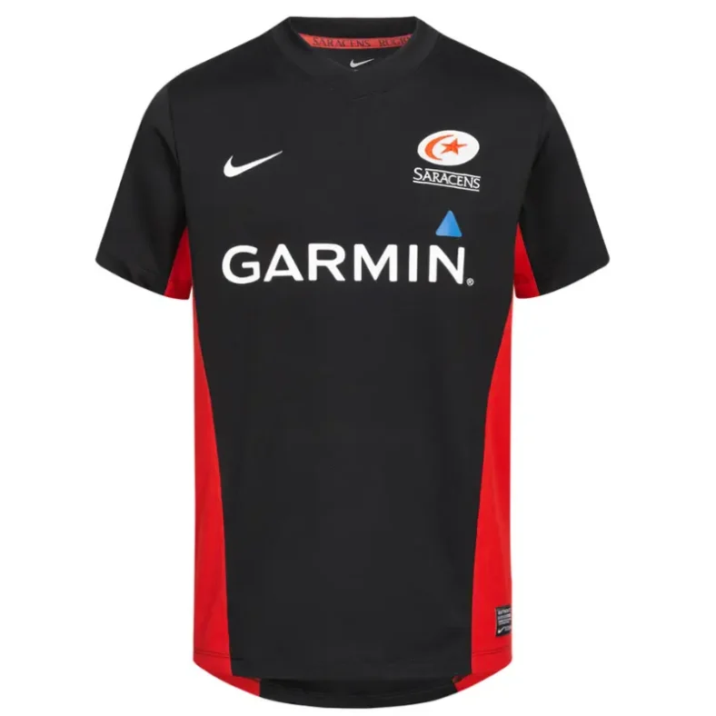 El diseño de la camiseta refleja el prestigio del equipo Saracens, con detalles cuidadosamente bordados que muestran el logotipo de la marca Nike en el pecho derecho y el escudo del club en el pecho izquierdo. El logotipo del patrocinador impreso en el centro completa el diseño, dándole un estilo profesional.