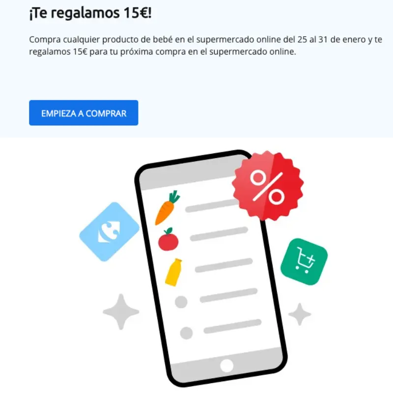 Compra cualquier producto de bebé en el supermercado online del 25 al 31 de enero y te regalan 15€ para tu próxima compra en el supermercado online de Carrefour.
