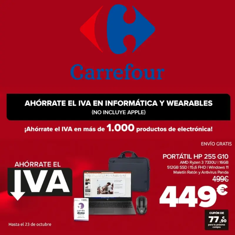 🖥️ ¡Aprovecha la promoción de Carrefour y ahórrate el IVA en informática y wearables! 💥 Solo hasta el 23 de octubre, disfruta de descuentos equivalentes al IVA en una amplia selección de ordenadores, tablets, monitores e impresoras. Es la ocasión perfecta para renovar tu equipo tecnológico y conseguir los mejores dispositivos al precio más bajo del año. ⚡