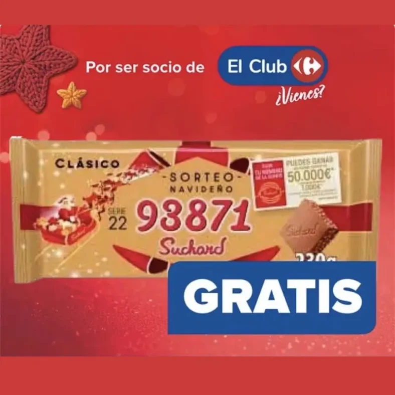 Carrefour sorprende a sus clientes con una tableta de Turrón Suchard de 230 g gratis 🎁. La promoción está disponible para todos los miembros de Carrefour que realicen compras superiores a 20 € en los hipermercados de la cadena.