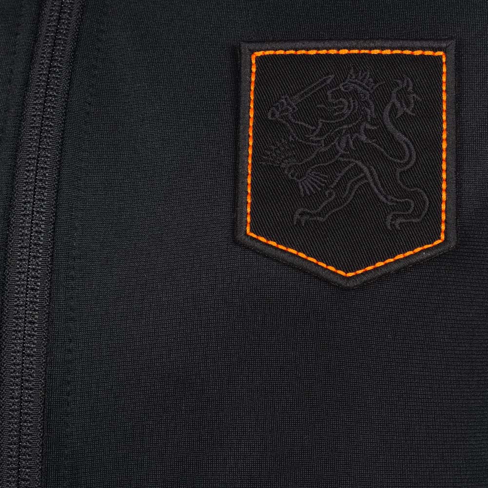 La chaqueta cuenta con una cremallera completa, cuello alto, bolsillos laterales abiertos y un corte ajustado que se adapta al cuerpo para brindar calidez y comodidad. Disponible en color negro, su diseño se completa con un discreto parche con el escudo del club en la parte izquierda del pecho.