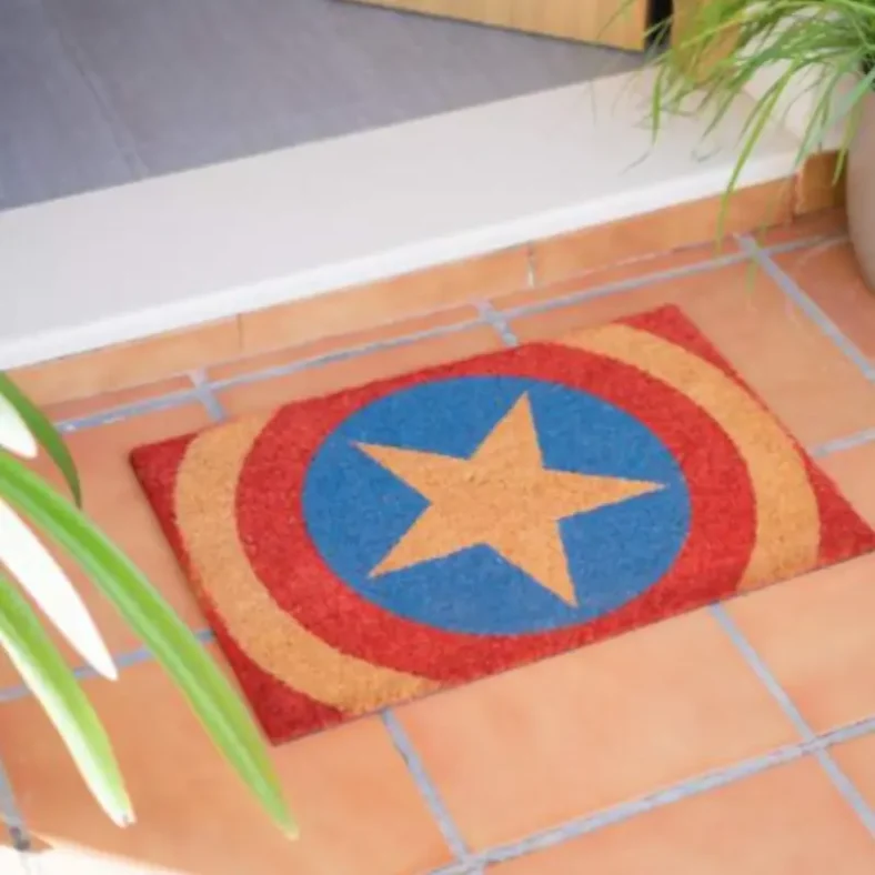 El felpudo del Capitán América presenta el icónico emblema del superhéroe, con un diseño llamativo que resalta los colores vibrantes y la forma característica del escudo. Su estética temática añade personalidad y un toque heroico a la entrada del hogar, sin perder funcionalidad.