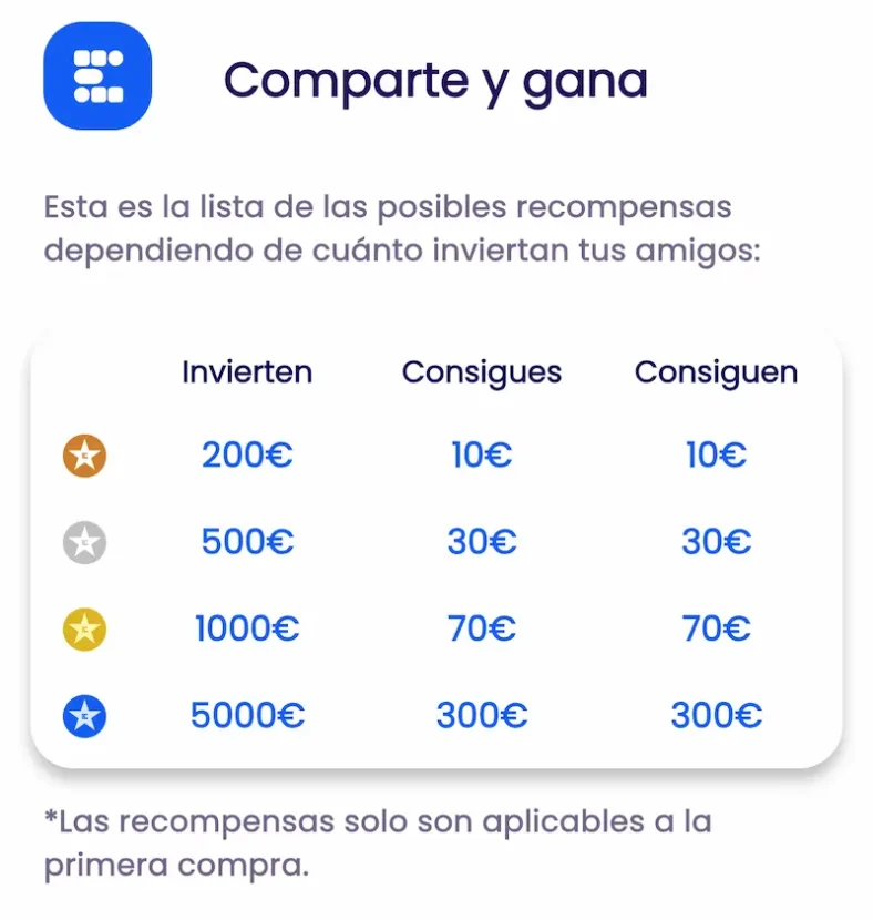 Recuerda que, para conseguir las recompensas, solo aplica la 1ª inversión que realices en la plataforma. Es decir, que si haces 5 inversiones de 1.000€ cada una, no recibirás el bono de 300€ aunque hayas invertido 5.000€ en total, sino que te llevarás el de 70€.