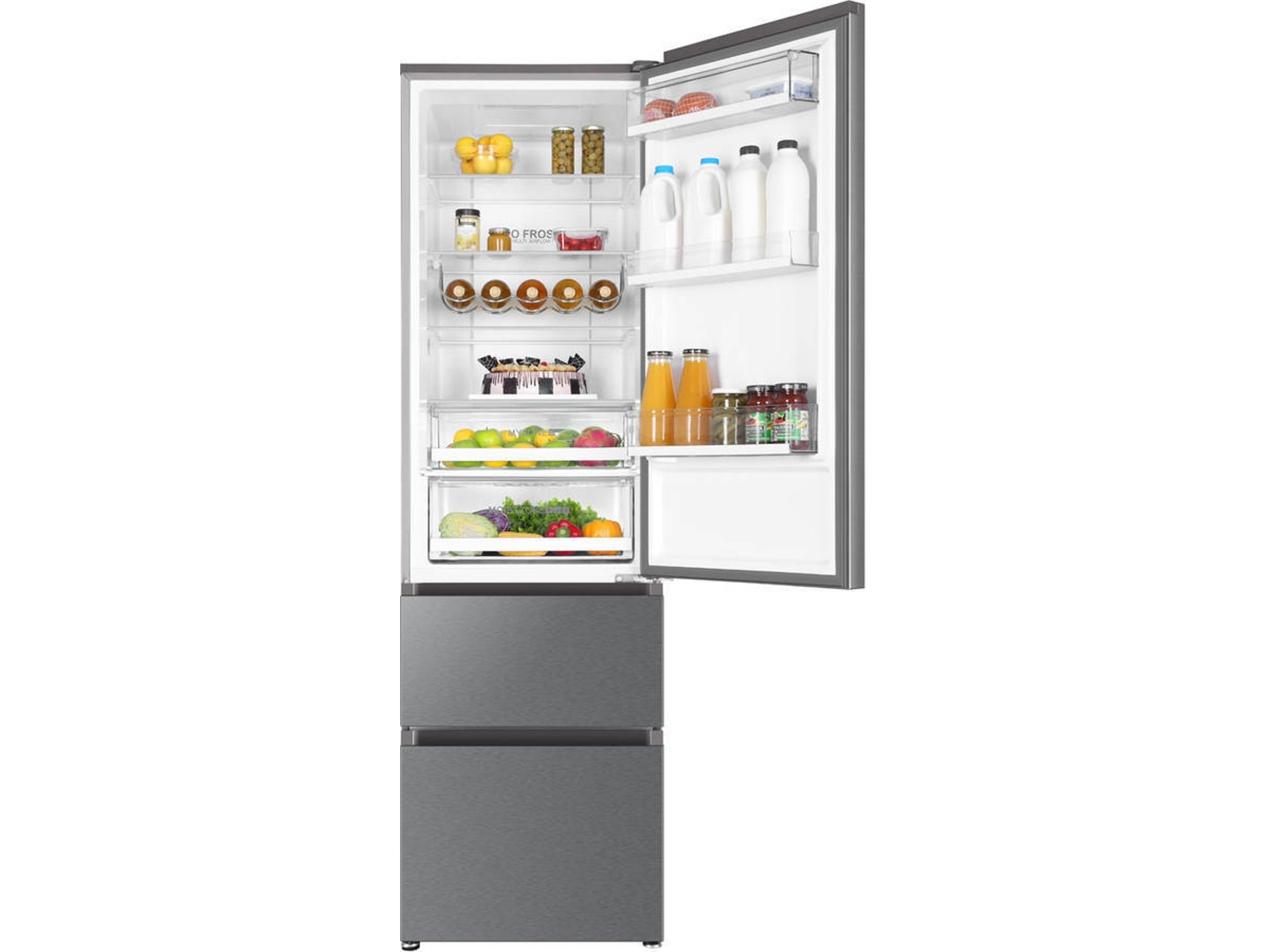 Con un elegante acabado en acero inoxidable y unas dimensiones de 200 x 60 cm, este frigorífico combi Haier de precio accesible ofrece una capacidad de 354 litros. Gracias a su motor Inverter silencioso, es capaz de ahorrar hasta un 60% más de energía en comparación con modelos similares, todo sin sacrificar su eficiente iluminación LED interior, que te permite ver claramente todos los alimentos almacenados.