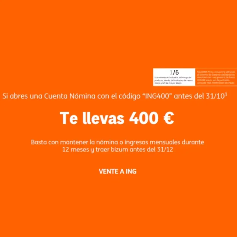1️⃣ Abre tu Cuenta NÓMINA fácilmente desde este enlace e introduce el código ING400 en la primera pantalla. Durante el proceso también se abrirá tu Cuenta NARANJA de ahorro, totalmente gratuita.