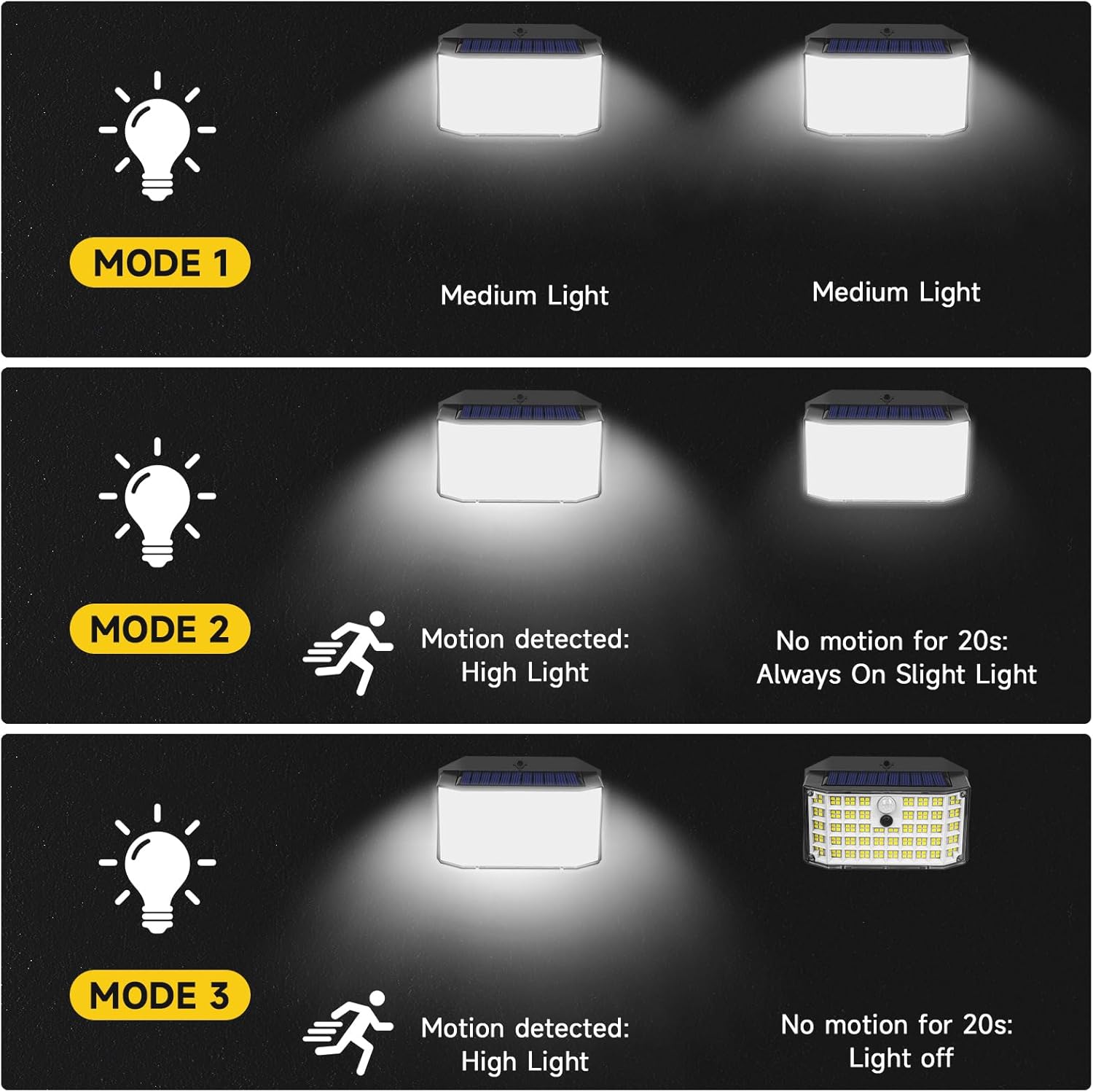 El Haokiang 4 Pack de luces solares exteriores de 2000 LM es una solución perfecta para iluminar tu jardín, patio o garaje de forma potente, ecológica y segura 🌞. Su diseño inteligente con sensor de movimiento y tres modos de iluminación ajustables te permite elegir entre luz constante, luz tenue o iluminación intensa al detectar movimiento.