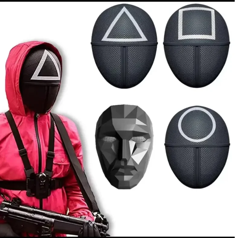 Las máscaras del Juego del Calamar son símbolos icónicos de control y jerarquía, representando la estructura estricta del juego. Cada máscara, adornada con figuras geométricas como círculo, triángulo y cuadrado, indica el rango y las funciones de los participantes en el sistema, desde los trabajadores comunes hasta los supervisores. Su diseño minimalista y misterioso no solo oculta identidades, sino que también refuerza la atmósfera de tensión y anonimato que caracteriza la serie.