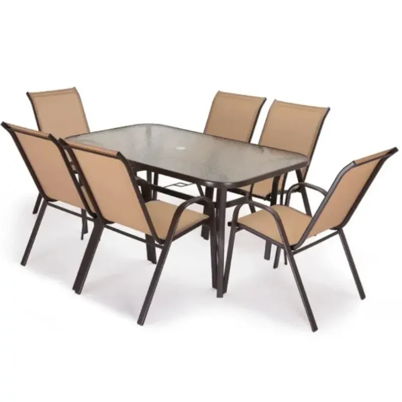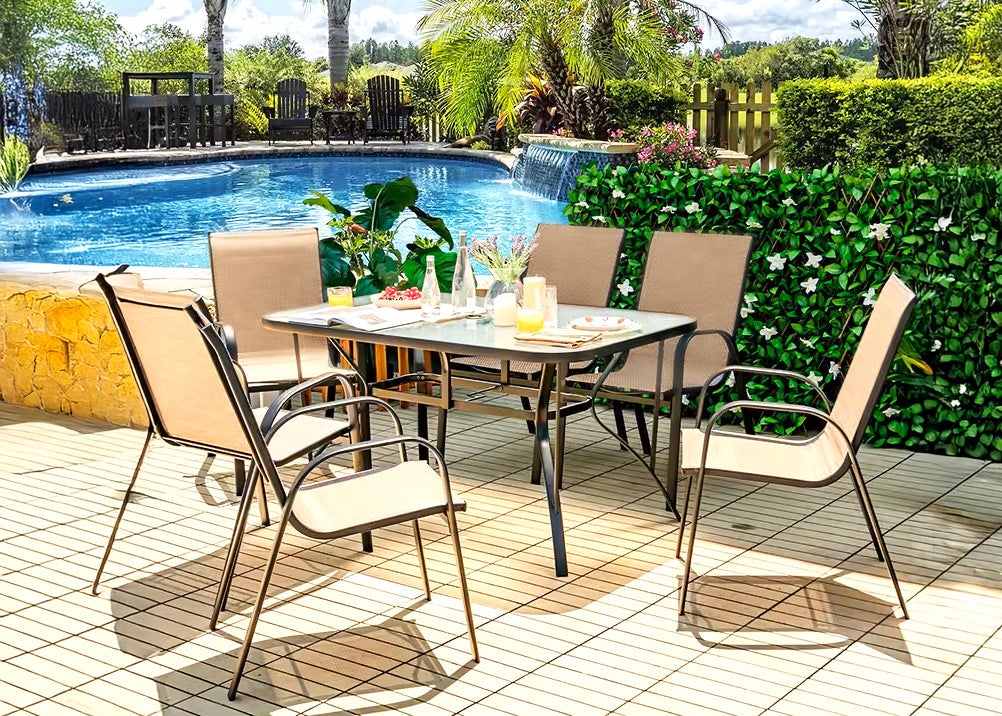La mesa cuenta con una estructura metálica con tratamiento anticorrosión, lo que garantiza una mayor durabilidad frente a la humedad y el uso exterior 💪. Su superficie de cristal templado aporta un acabado resistente, estable y fácil de limpiar, ideal para apoyar todo tipo de vajilla o utensilios. Además, las 6 sillas con estructura metálica y tejido flexible ofrecen una sentada más cómoda y ergonómica, adaptándose mejor que las superficies rígidas y mejorando la experiencia de uso durante largos periodos 😌.