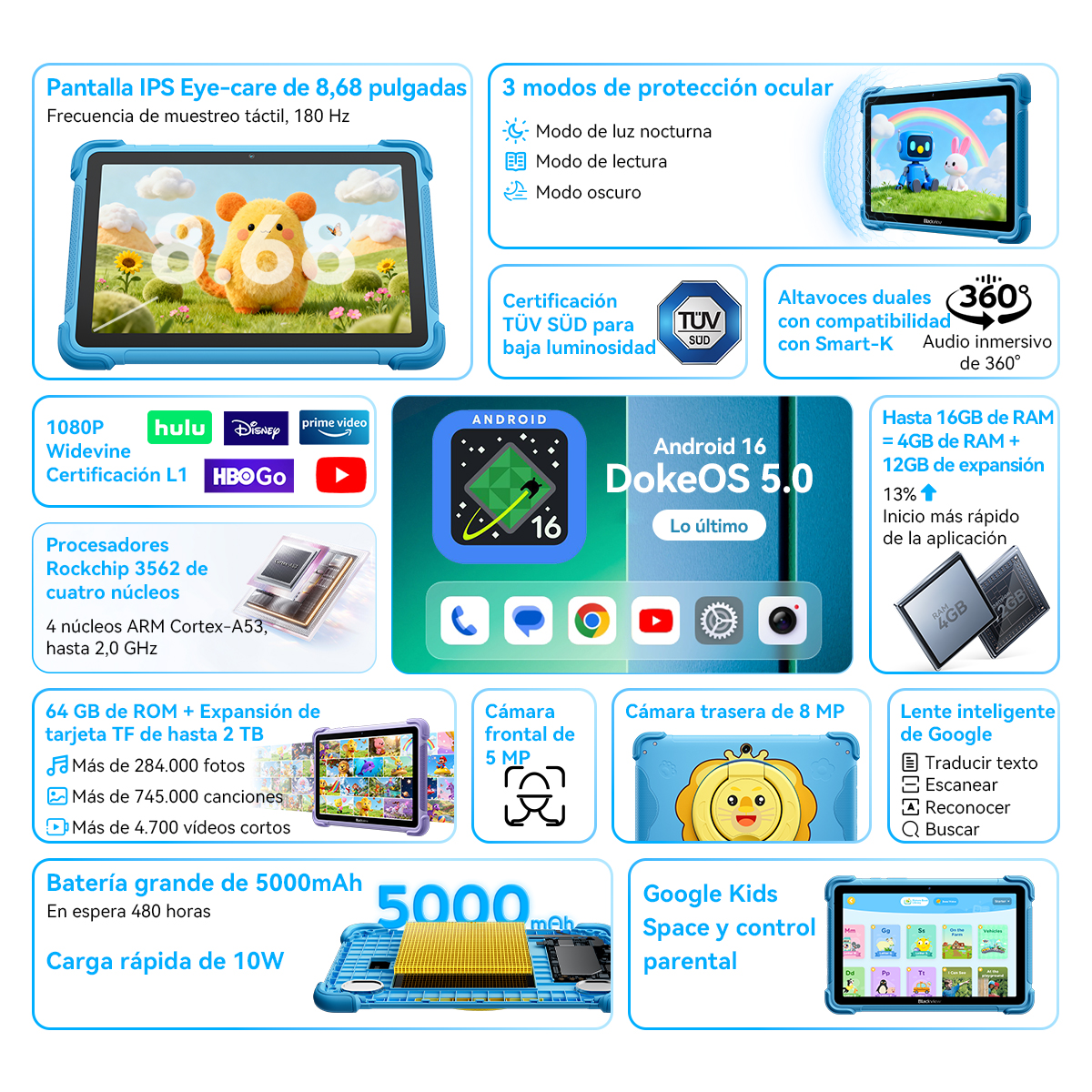 La experiencia visual está cuidada gracias a su pantalla IPS de 8,68 pulgadas con certificación TÜV SÜD, diseñada para proteger la vista de los niños 👀. Incluye modos de lectura, luz nocturna y modo oscuro, además de compatibilidad con Widevine L1, lo que permite disfrutar de contenido en calidad 1080p en plataformas como Netflix o Disney+.