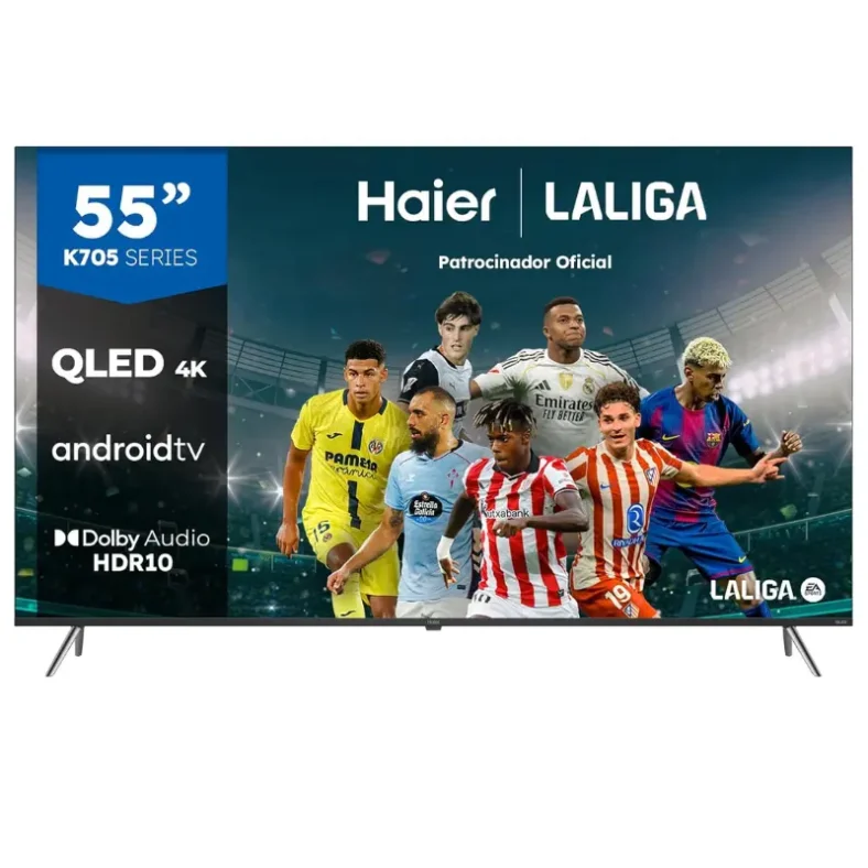 En cuanto a dimensiones, este modelo mide 122,9 x 77,4 x 26,5 cm con peana y 122,9 x 71,0 x 6,3 cm sin peana, lo que lo hace perfecto para cualquier espacio moderno. En conjunto, el Haier QLED H55K705UG es una opción que une potencia, inteligencia y diseño para ofrecer una experiencia audiovisual de primer nivel 💫.