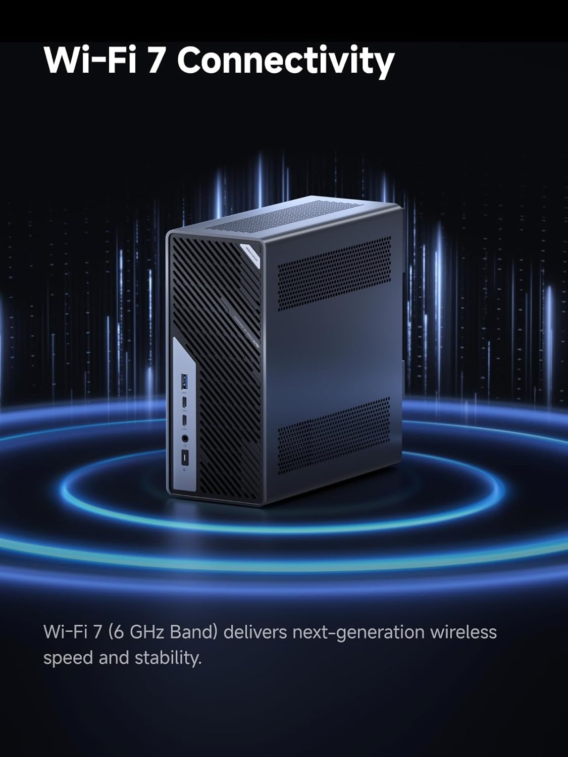 En conectividad, brilla con Wi-Fi 7, puertos 25 GbE, 10 GbE y 2.5 GbE, garantizando transferencia masiva de datos y gestión remota avanzada mediante Intel vPro. Su arquitectura de refrigeración tipo servidor, con seis canales y dos ventiladores, mantiene un rendimiento estable de 100 W TDP con tan solo 36 dB de ruido, mientras que la fuente de 350 W asegura fiabilidad constante.