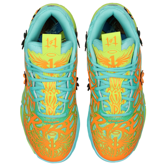 El soporte trasero está reforzado mediante una talonera de TPU, que proporciona estabilidad y reduce el riesgo de torsión. En esta misma zona, destacan llamas gráficas que aportan un toque distintivo 🔥. Además, se pueden encontrar frases ocultas como “1 OF ONE”, “RARE” y “NOT FROM HERE” integradas sutilmente en distintas partes del modelo, en línea con el estilo de LaMelo Ball.