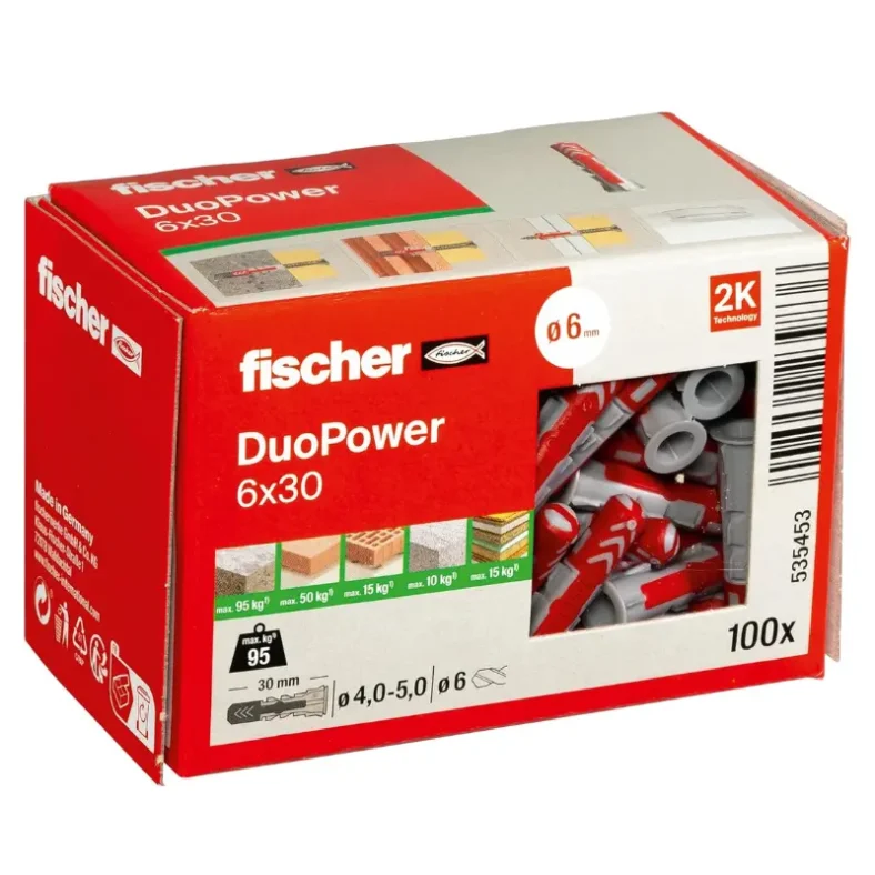 Los tacos Fischer DUOPOWER incorporan un innovador sistema de dos componentes (gris y rojo) que se adapta de forma automática al material de construcción. Según la superficie, el taco decide expandirse, plegarse o anudarse, ofreciendo siempre una sujeción firme y segura 🔩.