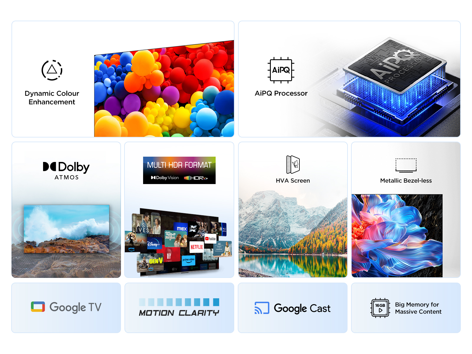 El potente procesador AiPQ analiza cada cuadro en tiempo real, ajustando la calidad de imagen con algoritmos inteligentes para una experiencia visual fluida, nítida y envolvente. A esto se suma el sonido Dolby Audio, que proporciona un audio envolvente y detallado, ideal para sentirte dentro de cada escena 🎧.