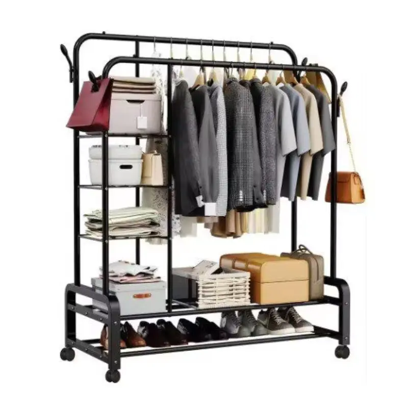 Este perchero cuenta con dos barras horizontales para colgado, cada una equipada con topes antideslizantes en sus extremos, que previenen que la ropa se deslice o caiga. Además, está dotado de cuatro ganchos laterales y tres estantes, proporcionando espacio extra para almacenar artículos como zapatos, bolsos y accesorios diversos. Gracias a estos elementos adicionales, la capacidad organizativa del perchero es efectiva para cubrir necesidades diarias.