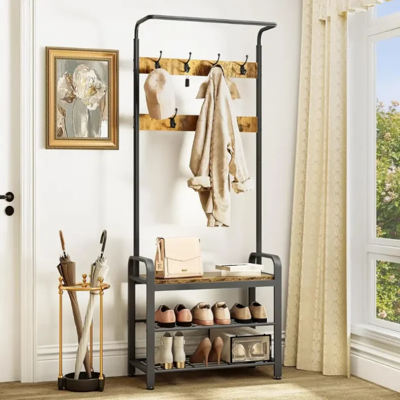 Este perchero con almacenamiento combina funcionalidad y estilo en un diseño 3 en 1 perfecto para cualquier pasillo. Con una barra superior robusta para colgar bufandas y perchas adicionales, ofrece ganchos múltiples para abrigos y bolsos. Montaje sencillo y mantenimiento fácil completan sus características destacadas.