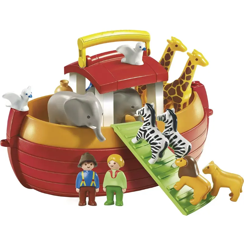 El arca cuenta con una rampa de acceso para que los animales puedan subir fácilmente al interior y estar a salvo del diluvio universal. El arca se convierte en un práctico maletín, ideal para guardar todas las figuras y animales, facilitando su transporte a cualquier lugar. Este juguete es adecuado para niños mayores de 1.5 años.