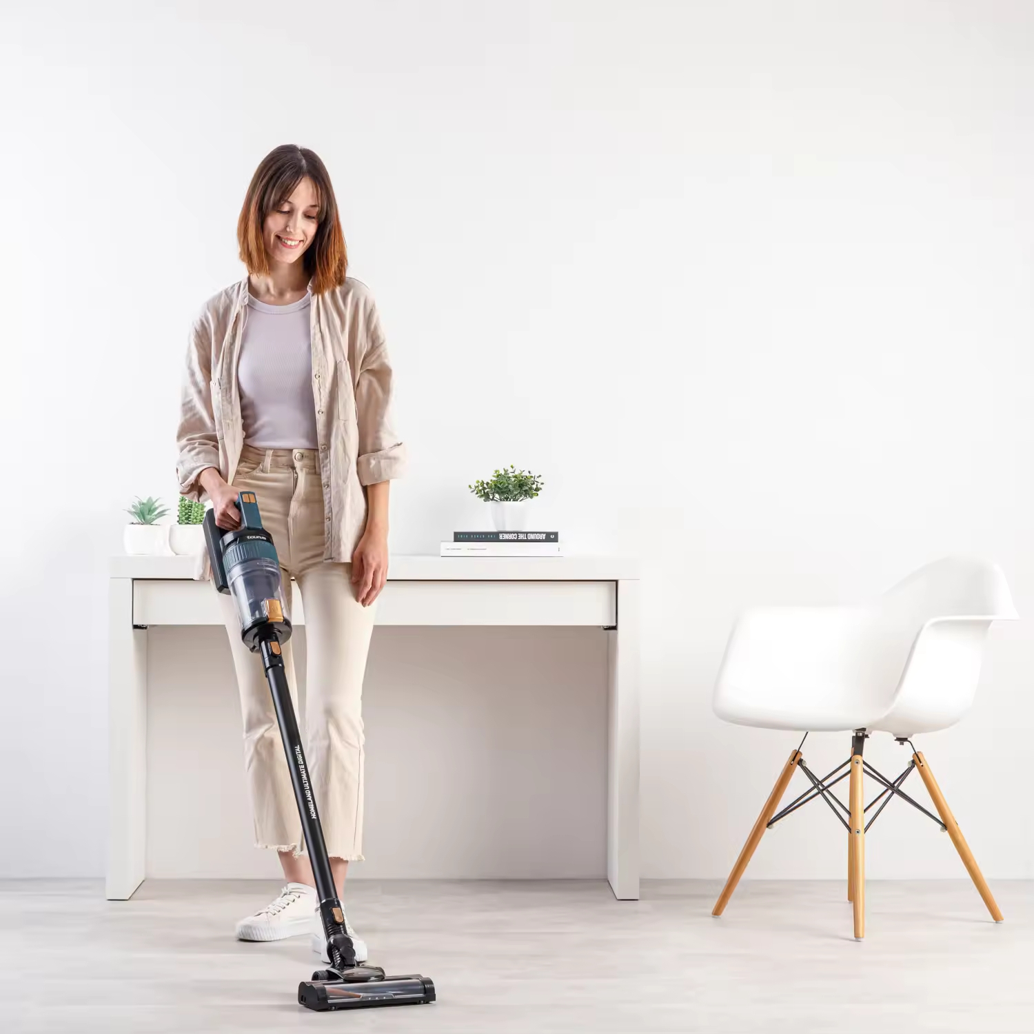 Con un cuerpo ultraligero de apenas 2 kg, es fácil de manejar y permite moverlo sin esfuerzo. Además, cuenta con un display LED que proporciona información sobre el estado de la batería y la velocidad seleccionada, ofreciendo una experiencia de uso intuitiva. Con una autonomía de hasta 55 minutos, puedes limpiar cada habitación sin interrupciones y sin preocuparte por las limitaciones de los cables.