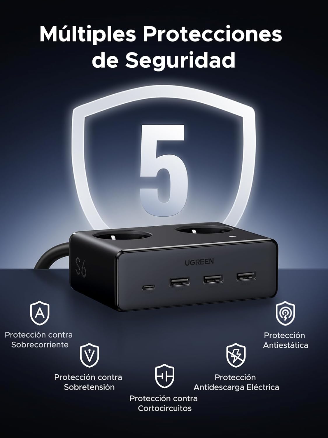 Protección total para tus dispositivos: con medidas de seguridad avanzadas, como protección contra sobretensiones y rayos, este enchufe múltiple asegura que tus dispositivos estén a salvo frente a fluctuaciones de energía.