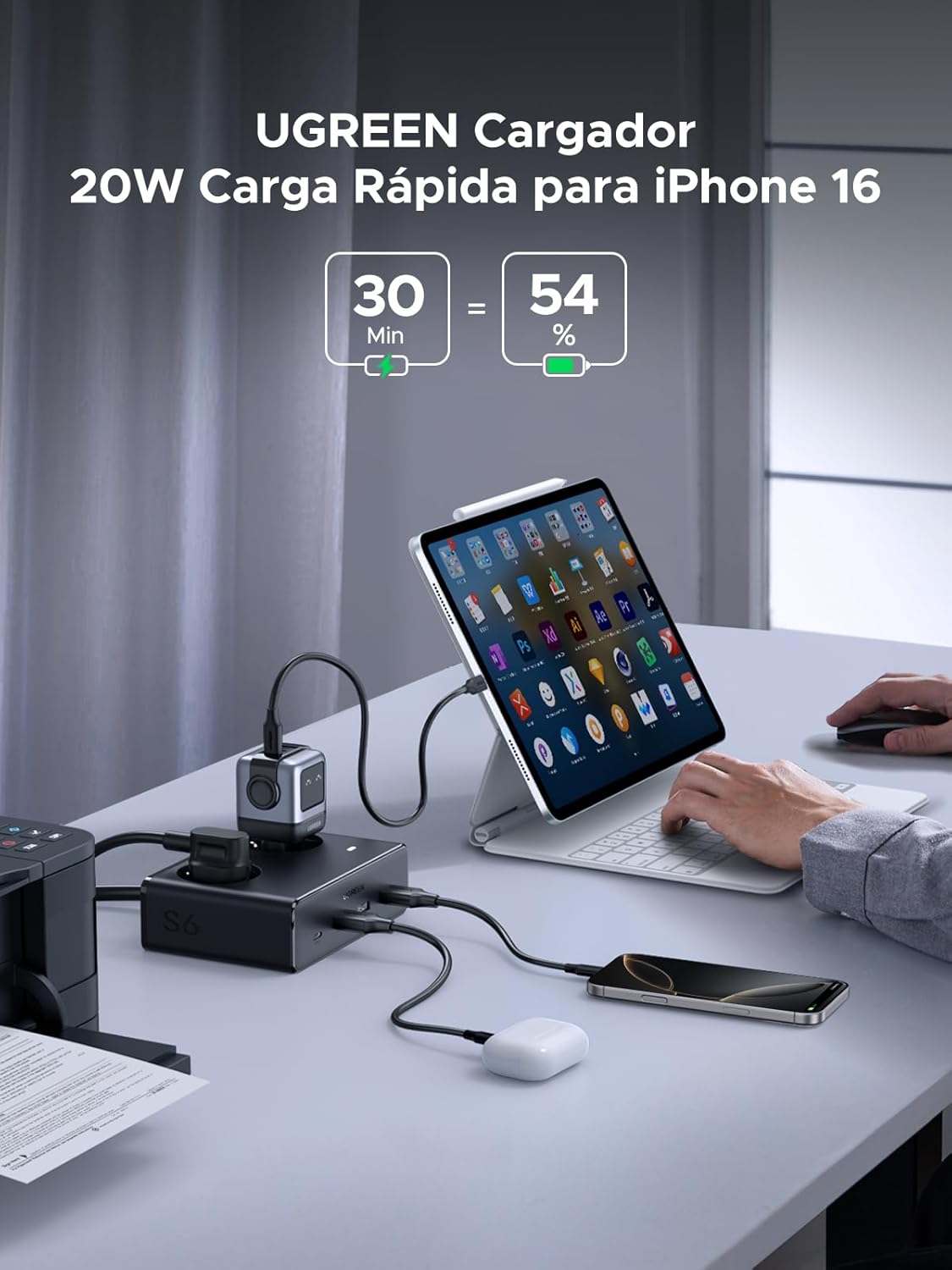 Este enchufe cuenta con 3 USB A, 1 USB C y 2 enchufes AC, ideales para cargar todos tus dispositivos en casa, la oficina o de viaje. Los enchufes AC ofrecen una potencia de hasta 3680W, perfecta para electrodomésticos y equipos del hogar. Además, el USB C de 20W (12V/1,67A) y los USB A de 15W (5V/3A) garantizan una carga rápida para teléfonos, portátiles y otros dispositivos.